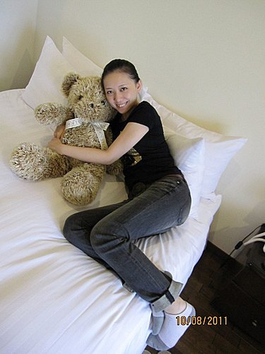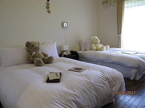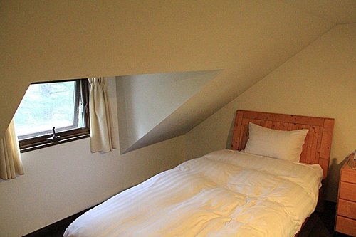 這裡的房間走的是溫馨路線,一進門就可以看到兩隻泰迪熊坐在床上歡迎我們,小木屋的風格中有許多無印良品的作品點綴其中,從狹窄的木梯往上爬,夾層上還有一張小床。從客房的窗戶向外看,也是與餐廳同樣漂亮的景色,進入這間小木屋,身心都有被解放的感覺!那就是渡假的感覺!