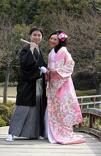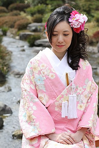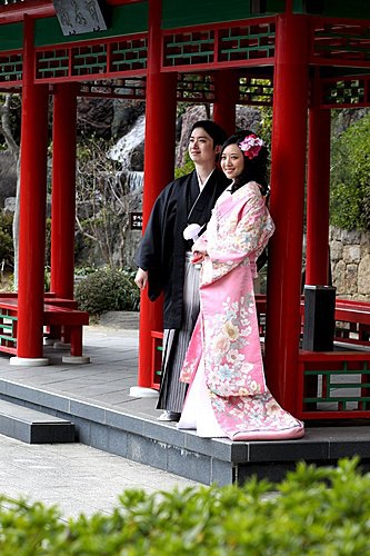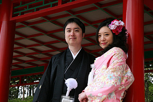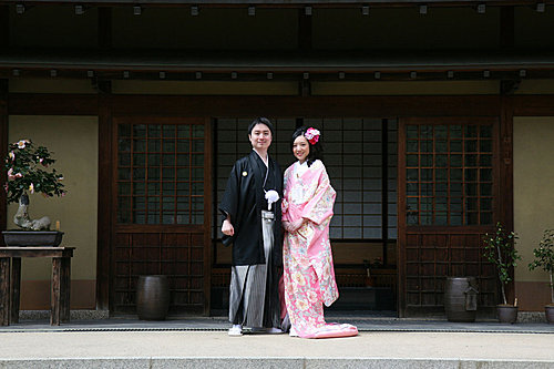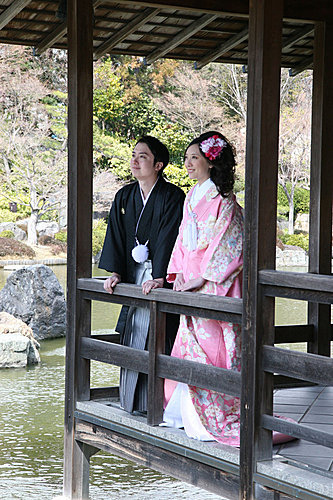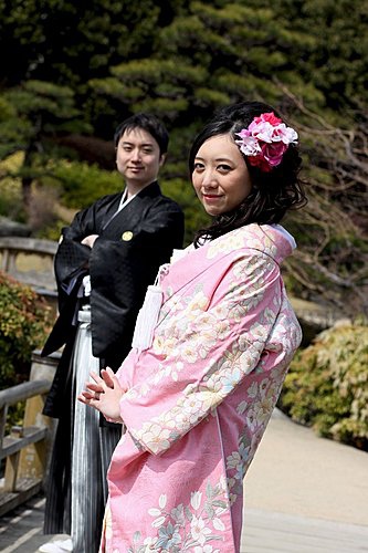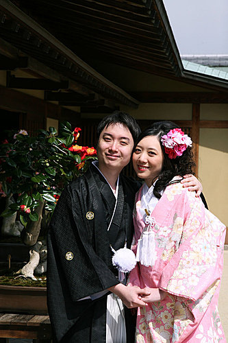 這次的外拍我們只有一套服裝,男生其實沒差,而孟君選擇外拍的是比較活潑的"色打掛",也就是那件外套是有顏色的。我們會選擇粉紅色,一來是因為孟君喜歡粉色,二來是現場看到的粉紅色色打掛真的很漂亮,不過相片出來後有點後悔,因為粉紅色比較難照出效果。而白無垢與振袖我們選擇在京都拍,所以今天只有一套服裝。