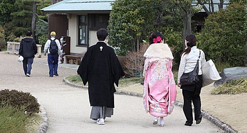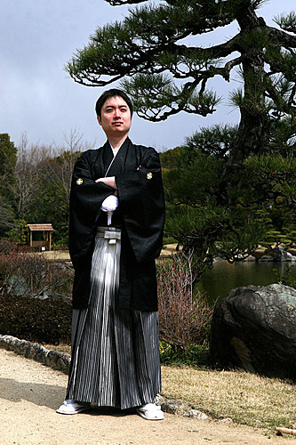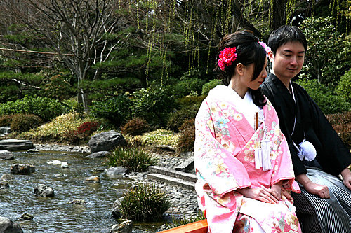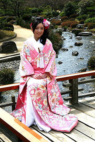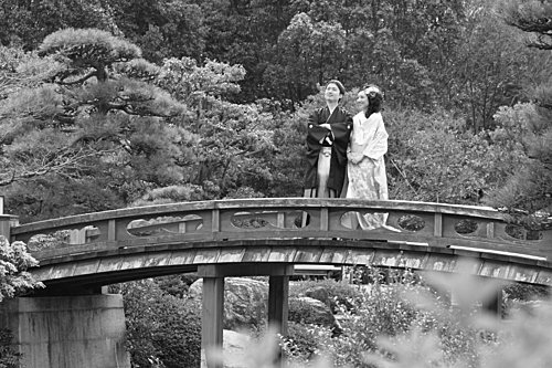 回到ARC Studio,工作人員幫我換上和服後,在許多店員的掌聲與笑容下,歡送我們上計程車,準備到附近"大千公園"內的日式庭園拍照。 一路上路人都對我們投以好奇的眼光,似乎日本當地的人也不常這樣出外景拍照吧。還有一群年紀比較大的遊客看到我們居然集體鼓掌大聲叫好,太讓我們受寵若驚了吧。(不會他們其實是在笑我水腫很厲害吧!)