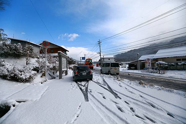 鏟雪車來回在湯野神社旁的道路上清運積雪,試圖讓往來的車輛可以更安