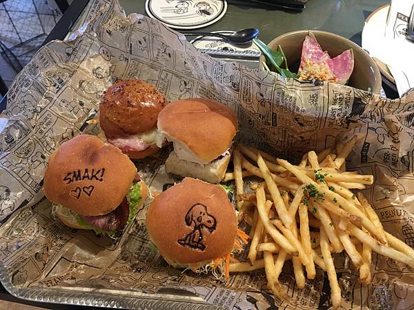 到了之後確認了訂位姓名,直接被帶到2樓,這棟建物通往2樓的樓梯在戶外,白色的建築物牆上裝飾著Snoopy燈箱十分可愛,ㄧ到2樓馬上就有服務員引導座位,menu選項有pizza跟小漢堡及沙拉跟飲料,偷偷觀察一下大家點什麼發現都會點Snoopy小漢堡,所以我們也點了一份再加上woodstock鳥巢薯條以及兩杯奶昔。