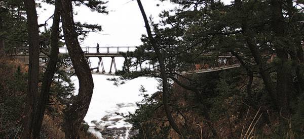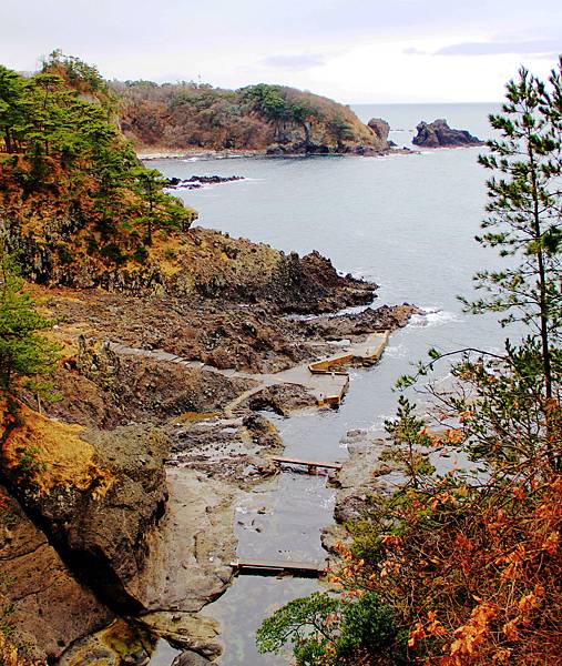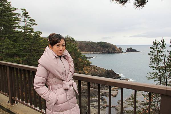 日本海侵蝕的海岸線,搭配兩旁佇立於崖上的青松,這景色讓人感到壯觀