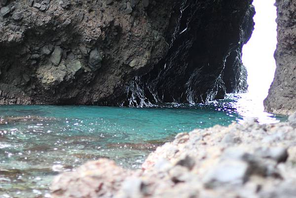 怪石以不規則的形狀阻擋著海水的入侵,在怪石一側的海水,是平靜、通透