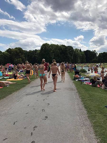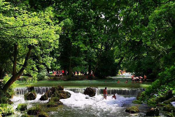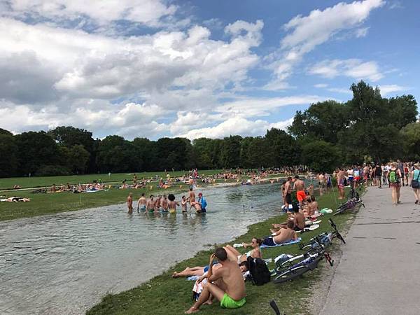 雖說德國人很守規矩,但是大家都無視禁止跳水游泳衝浪的告示牌,不過這也沒有辦法,畢竟以慕尼黑的地理位置來說,海邊實在太遠了!即使明文禁止下水,政府似乎也不想剝奪人民的樂趣,在水道盡頭仍設立了拉繩,讓大家被沖到下游抓著可以上岸,岸邊也做了扶手跟樓梯,雖說「禁止」與「便民」看似矛盾,但也展現了「我阻止不了你,但我會盡量保護你」的一種貼心。