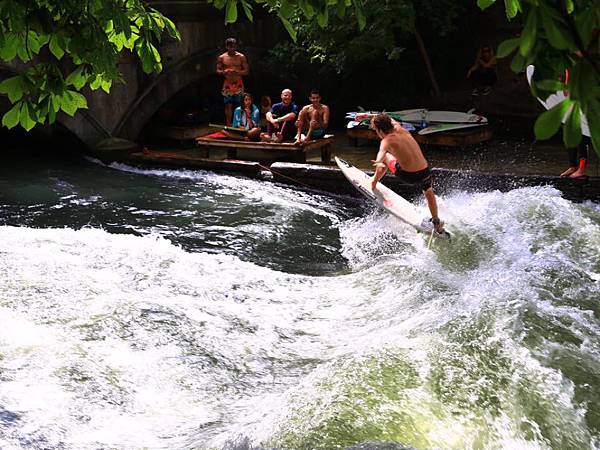 往河川上游走,又發現人群聚集處,天啊!竟然公園裡可以衝浪,這裡真是讓我大開眼界!水道的兩旁站著穿著潛水衣抱著浪板的型男美女,左邊跳下去衝到翻了,再換右邊的人下水,一左一右,每一次都是自己一個人享受窄窄的水道,周圍又充滿了觀眾,即使技術不好的衝浪者一下水就翻了,在那瞬間仍是帶著意氣風發的表情往水裡躺。