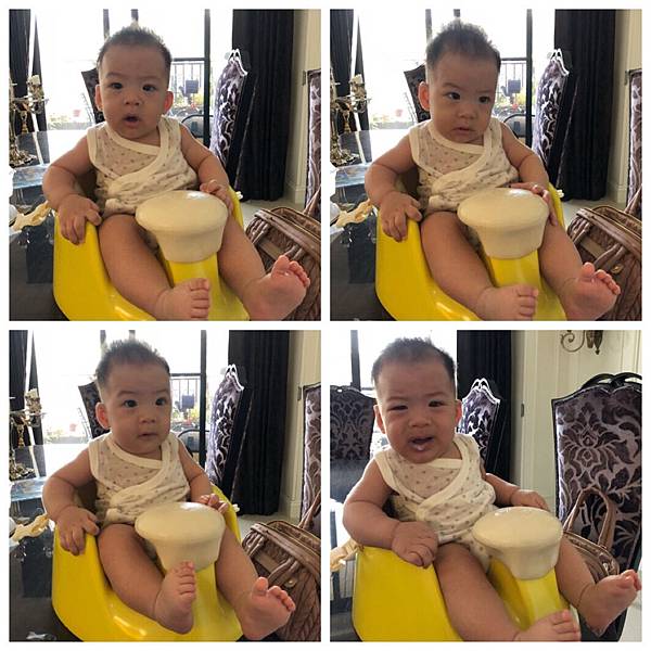 小子在兩三個月大的時候,開始不願意喝配方奶了,由於我是少奶的媽媽,只要當天全母奶就一定結晶尿,找了泌乳顧問感覺幫助不是很大,看醫生也說就儘量多餵或試試不同牌子的配方奶,總之結晶尿就斷斷續續一直撐到他4個月大,我想用副食品來補他奶量的不足,此時剛好接收朋友恩典牌的幫寶椅,坐上去超可愛的,只可惜那時還是太小不太習慣吃副食品,常常吃個5口就哭了。